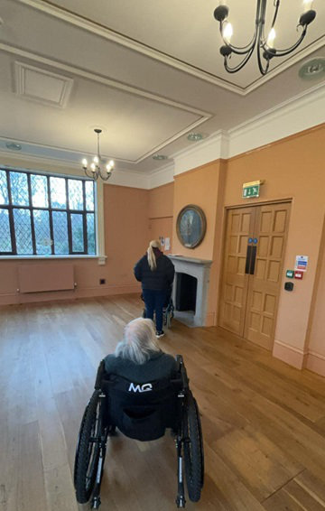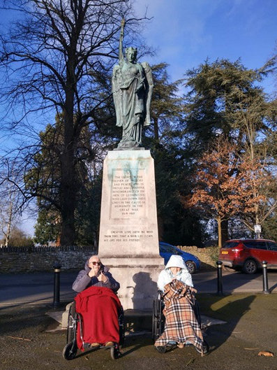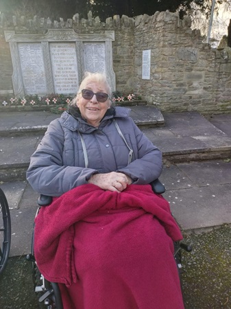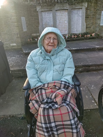 Val and Marjorie enjoying some fresh air, walking around the Grange